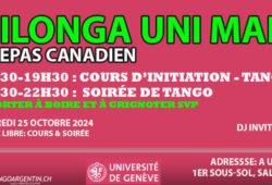 Archives Milonga Uni Mail Alejandro De Benedictis15 mai 2025 Milonga Uni Mail Mardi 20 mai 2025 18h-19h Cours d’initiation gratuit par Alejandro 19h-22h30 Soirée DJ: Lucrecio Robledo Entrée libre Salle...