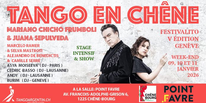 Festivalito Tango en Chêne V - 2026 - 5ème édition 3 Soirées, Djs, Démonstrations & stages de Tango Week-end 09, 10 et 11 janvier 2026 POUR LA PREMIÈRE FOIS À GENÈVE! MARIANO "CHICHO" FRUMBOLI & JUANA SEPULVEDA Programme: Toutes les informations1. STAGE INTENSIF AVEC MARIANO CHICHO FRUMBOLI ET JUANA SEPULVEDA (plus d'info) SOLD OUT !