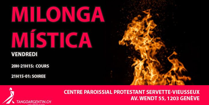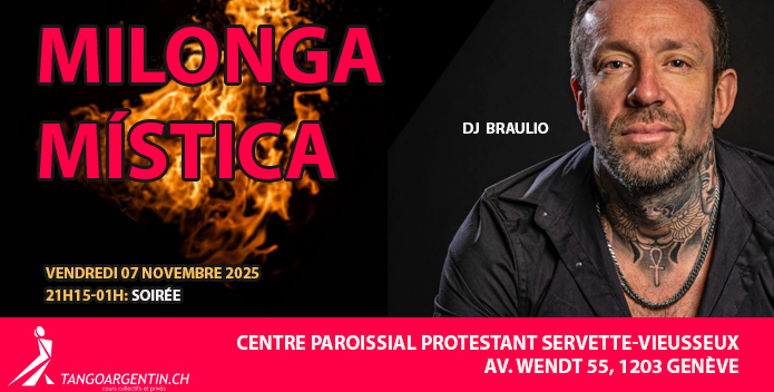 Milonga Mística Alejandro De Benedictis10 juillet 2023 Milonga Mística & Cours Vendredi 07 nov 2025 21h15-01h : Soirée. Dj Braulio Centre paroissial protestant Servette-Vieusseux Av. Wendt 55, 1203 Genève Prix soirée : 15.-chf www.tangoargentin.ch +41 79 279 41 85