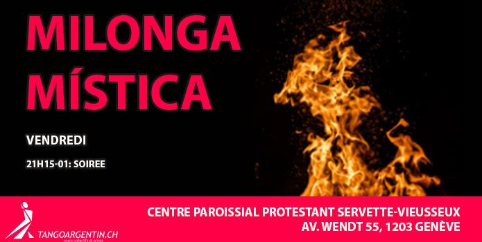 Milonga Mística Alejandro De Benedictis10 juillet 2023 Milonga Mística Vendredi 03 avril 2026 21h15-01h : Soirée. Centre paroissial protestant Servette-Vieusseux Av. Wendt 55, 1203 Genève Prix soirée : 15.-chf www.tangoargentin.ch +41 79 279 41 85