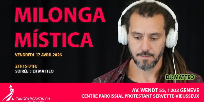 Milonga Mística Alejandro De Benedictis10 juillet 2023 Milonga Mística Vendredi 17 avril 2026 21h15-01h : Soirée. Dj Matteo Centre paroissial protestant Servette-Vieusseux Av. Wendt 55, 1203 Genève Prix soirée : 15.-chf www.tangoargentin.ch +41 79 279 41 85
